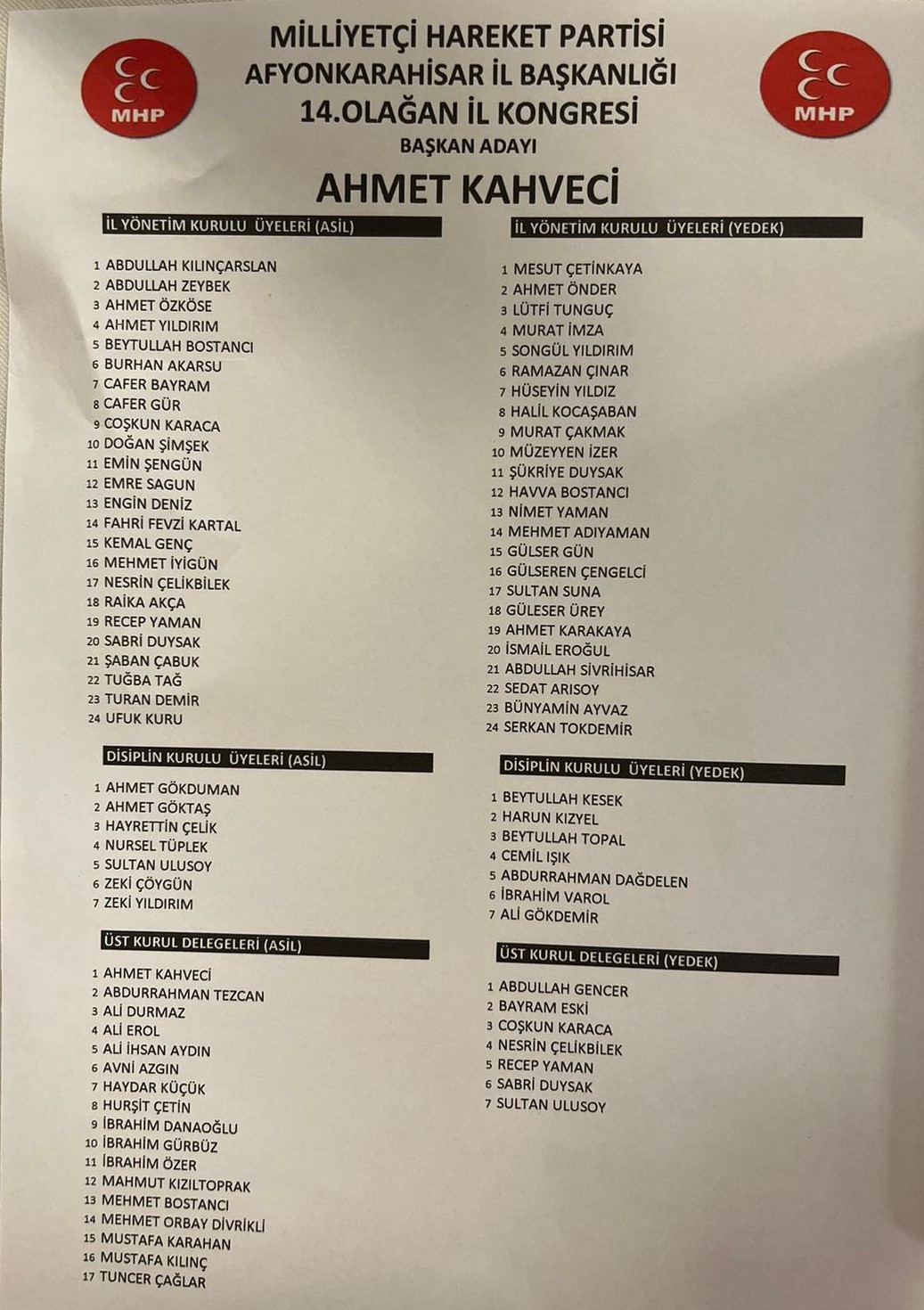 İyi Parti'de Katılım Yoğunluğu!Milliyetçi Hareket Partisi (MHP) Afyonkarahisar İl Başkanlığı bugün düzenlenen 14'üncü olağan kongresinde mevcut başkan Ahmet Kahveci'nin güvenini tazeledi. Kongre, kent merkezinde bulunan bir düğün salonunda gerçekleştirildi. MHP Grup Başkan Vekili Erkan Akçay'ın Divan Başkanlığı'nı üstlendiği kongrede, MHP Genel Başkanı Devlet Bahçeli'nin gönderdiği mesaj okundu. Faaliyet ve mali raporunun okunmasının ardından delegelerin oyuna sunulan rapor oybirliğiyle kabul edildi. Kongrenin açılışında konuşan Başkan Kahveci, ülkücülerin bugüne kadar siyasi zafer hırsızlığı peşinde olmadığını vurgulayarak, "MHP'nin tüm siyasi kazanımları sizlerin çabaları ve çalışmalarıyla gerçekleşmiştir. Bu nedenle MHP'nin hiç kimseye borcu yoktur. Haklının hakkının verilmesini bekliyoruz. Yerel seçimler için de hazırlıklarımızı sürdürüyoruz. Aday çıkaracak güç, kudret ve tecrübeye sahibiz. İl belediyesi ve ilçe/belde başkanlıkları için aday adaylarıyla yapılan görüşmeler devam ediyor" şeklinde konuştu.
